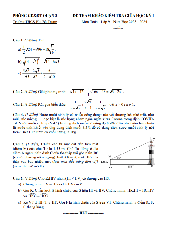 Đề tham khảo giữa kỳ 1 Toán 9 năm 2023 – 2024 trường THCS Hai Bà Trưng – TP HCM