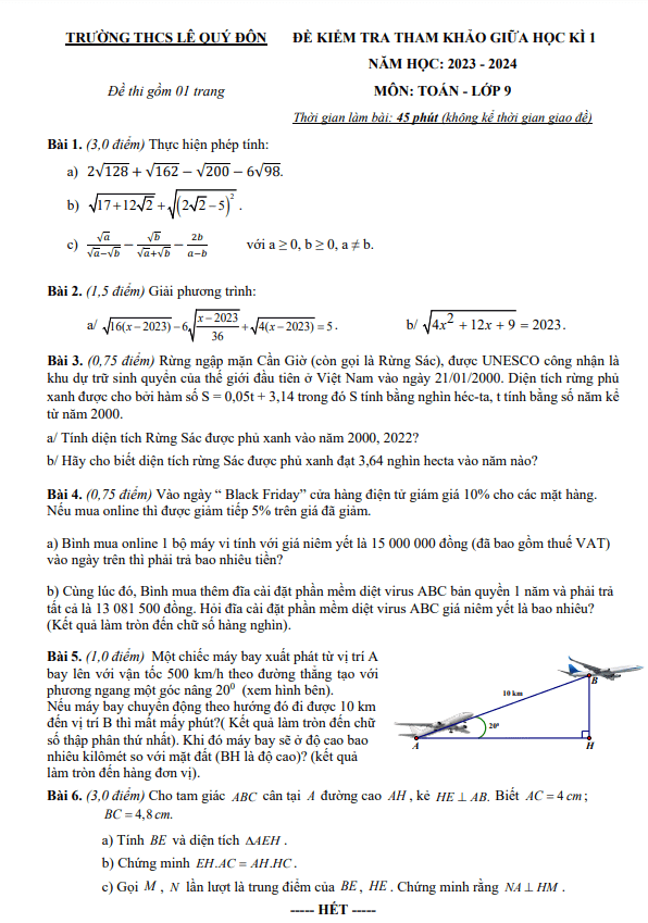 Đề tham khảo giữa kỳ 1 Toán 9 năm 2023 – 2024 trường THCS Lê Quý Đôn – TP HCM