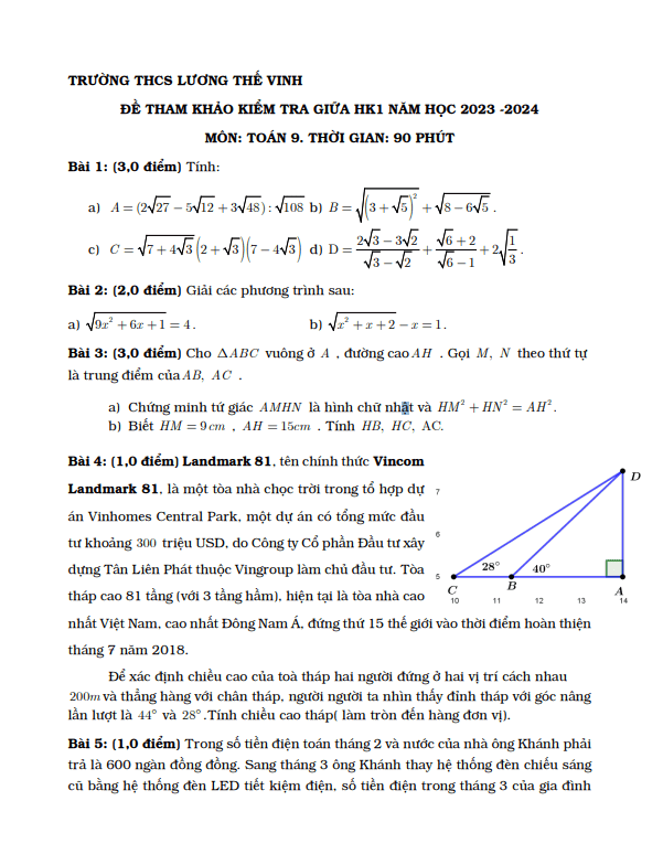 Đề tham khảo giữa kỳ 1 Toán 9 năm 2023 – 2024 trường THCS Lương Thế Vinh – TP HCM