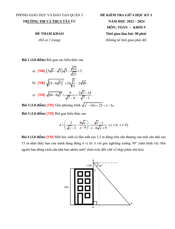 Đề tham khảo giữa kỳ 1 Toán 9 năm 2023 – 2024 trường TiH – THCS Tây Úc – TP HCM