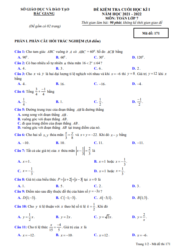 Đề kiểm tra cuối học kì 1 Toán 7 năm 2021 – 2022 sở GD&ĐT Bắc Giang