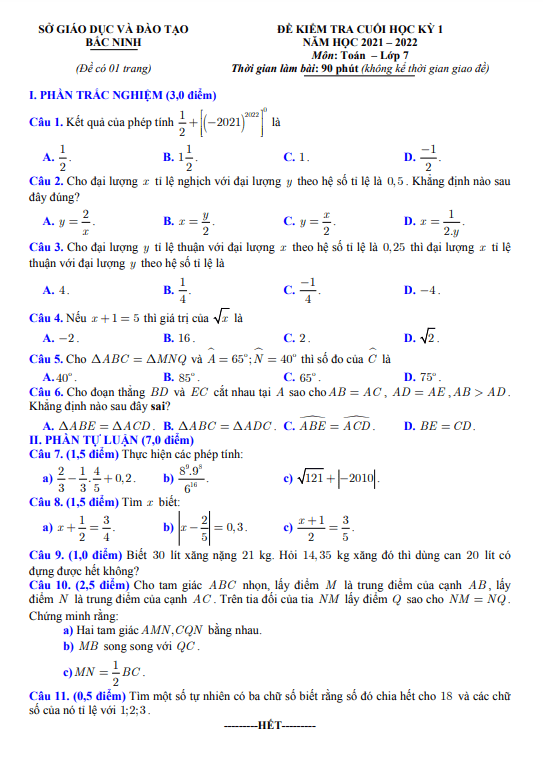 Đề kiểm tra cuối học kỳ 1 Toán 7 năm 2021 – 2022 sở GD&ĐT Bắc Ninh