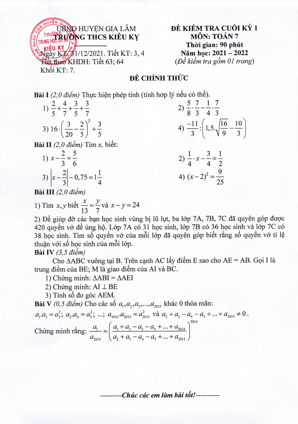 Đề kiểm tra cuối kỳ 1 Toán 7 năm 2021 – 2022 trường THCS Kiêu Kỵ – Hà Nội