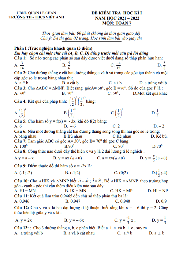 Đề kiểm tra học kì 1 Toán 7 năm 2021 – 2022 trường TH – THCS Việt Anh – Hải Phòng