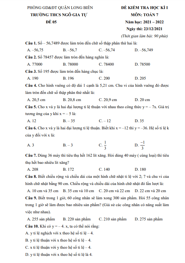 Đề kiểm tra học kì 1 Toán 7 năm 2021 – 2022 trường THCS Ngô Gia Tự – Hà Nội