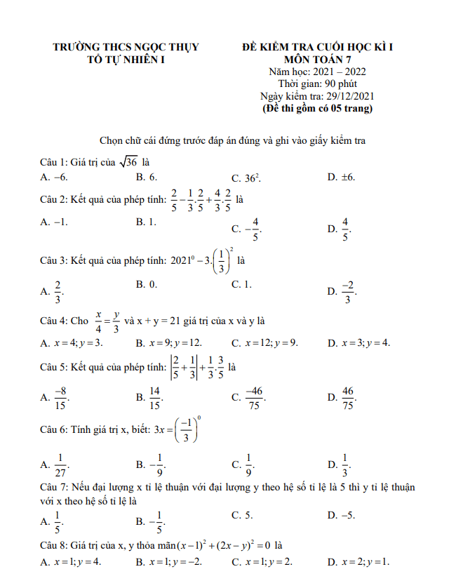 Đề kiểm tra học kì 1 Toán 7 năm 2021 – 2022 trường THCS Ngọc Thụy – Hà Nội