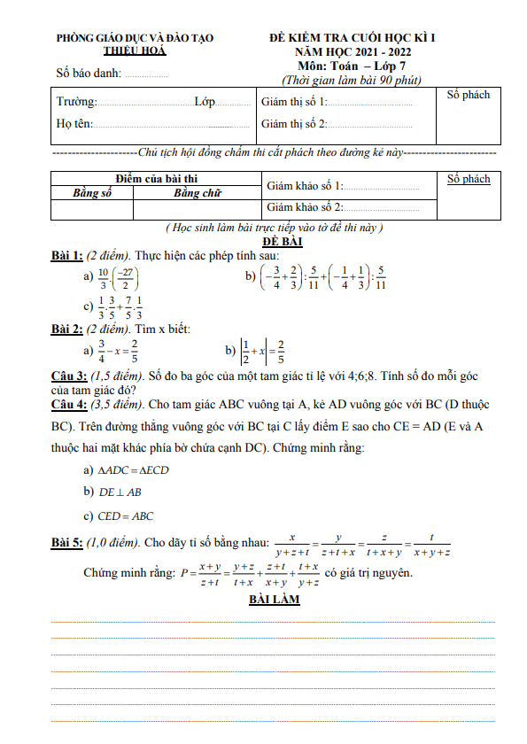 Đề thi cuối học kì 1 Toán 7 năm 2021 – 2022 phòng GD&ĐT Thiệu Hóa – Thanh Hóa