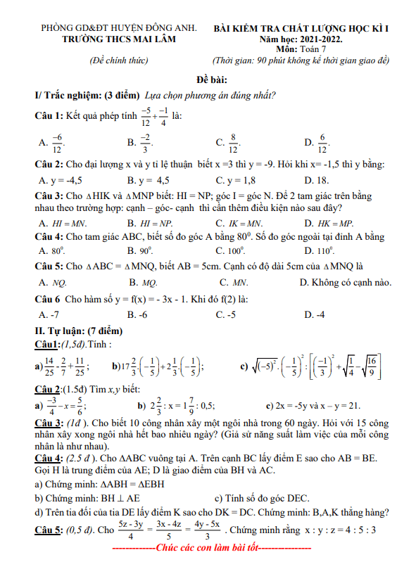 Đề thi học kì 1 Toán 7 năm 2021 – 2022 trường THCS Mai Lâm – Hà Nội