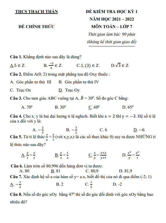 Đề thi học kỳ 1 Toán 7 năm 2021 – 2022 trường THCS Thạch Thán – Hà Nội