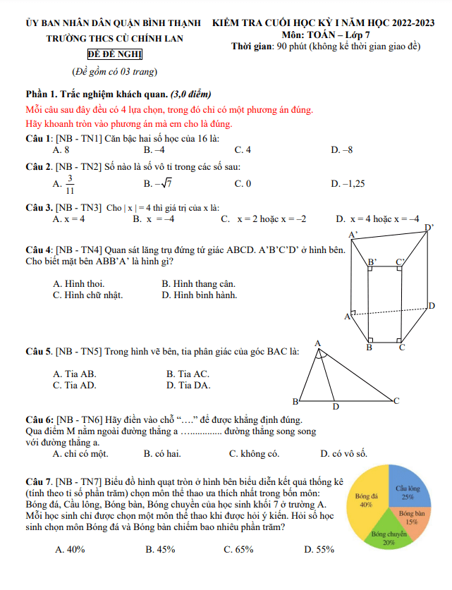 Đề đề nghị cuối kỳ 1 Toán 7 năm 2022 – 2023 trường THCS Cù Chính Lan – TP HCM