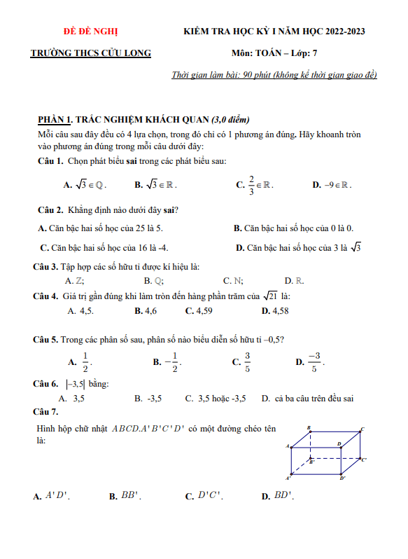Đề đề nghị cuối kỳ 1 Toán 7 năm 2022 – 2023 trường THCS Cửu Long – TP HCM