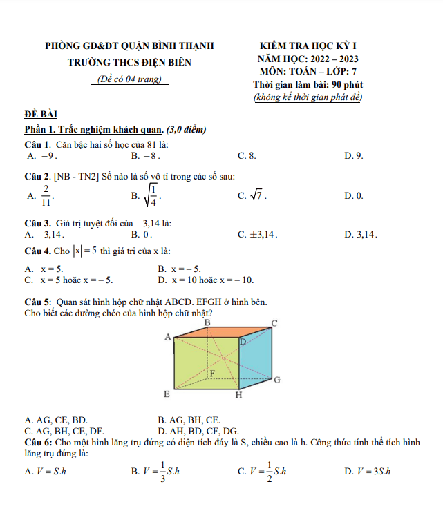 Đề minh họa cuối kỳ 1 Toán 7 năm 2022 – 2023 trường THCS Điện Biên – TP HCM