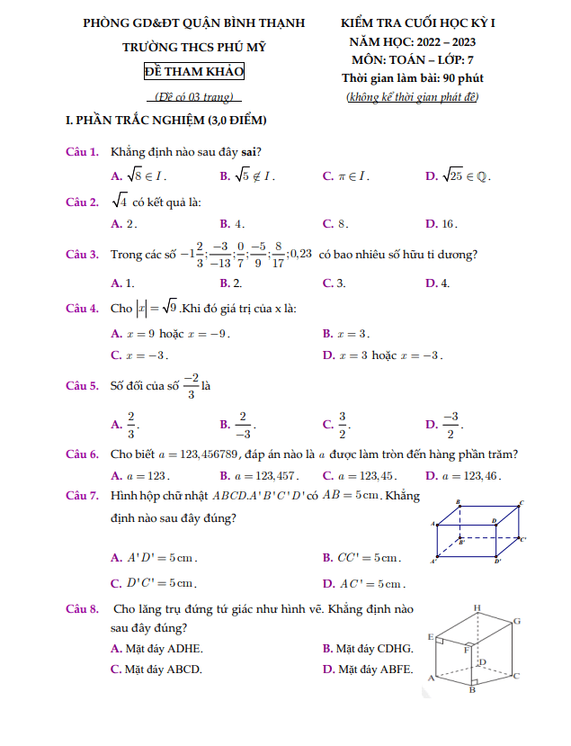 Đề tham khảo cuối kỳ 1 Toán 7 năm 2022 – 2023 trường THCS Phú Mỹ – TP HCM