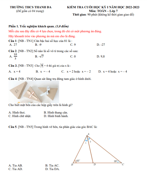 Đề tham khảo cuối kỳ 1 Toán 7 năm 2022 – 2023 trường THCS Thanh Đa – TP HCM