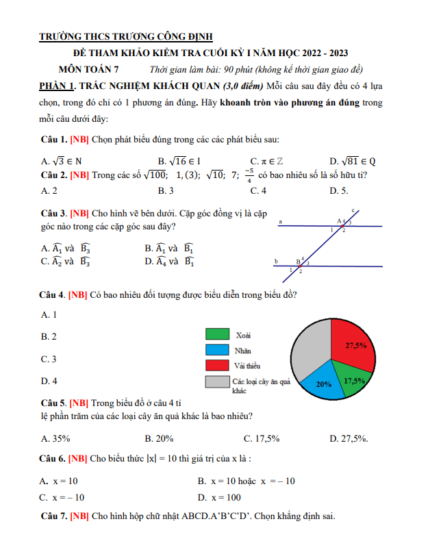 Đề tham khảo cuối kỳ 1 Toán 7 năm 2022 – 2023 trường THCS Trương Công Định – TP HCM
