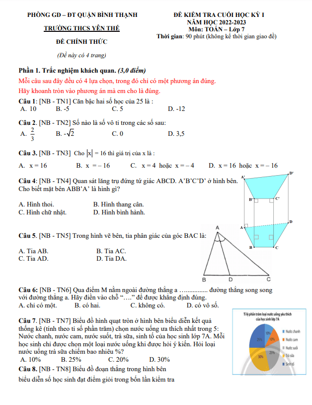 Đề tham khảo cuối kỳ 1 Toán 7 năm 2022 – 2023 trường THCS Yên Thế – TP HCM