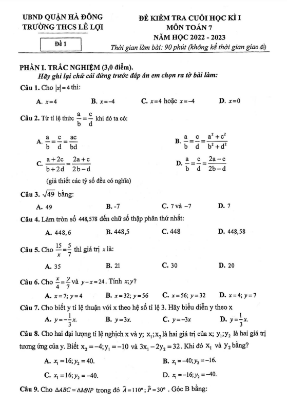 Đề cuối học kì 1 Toán 7 năm 2022 – 2023 trường THCS Lê Lợi – Hà Nội