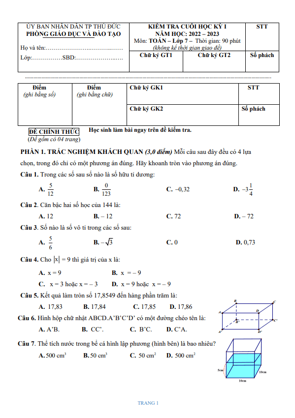 Đề cuối học kỳ 1 Toán 7 năm 2022 – 2023 phòng GD&ĐT Thủ Đức – TP HCM