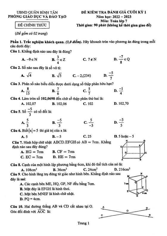 Đề cuối kỳ 1 Toán 7 năm 2022 – 2023 phòng GD&ĐT Bình Tân – TP HCM