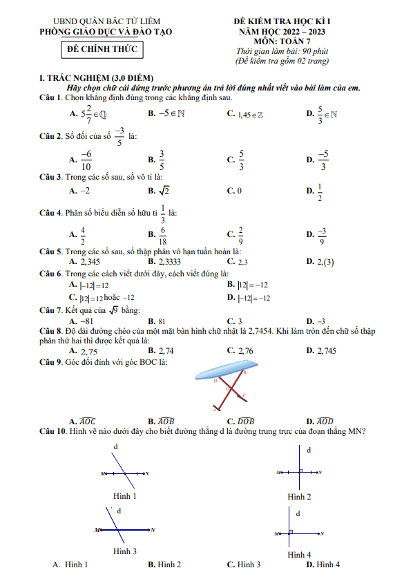 Đề học kì 1 Toán 7 năm 2022 – 2023 phòng GD&ĐT Bắc Từ Liêm – Hà Nội