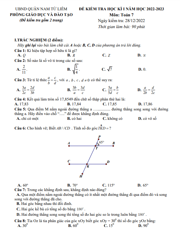 Đề học kì 1 Toán 7 năm 2022 – 2023 phòng GD&ĐT Nam Từ Liêm – Hà Nội