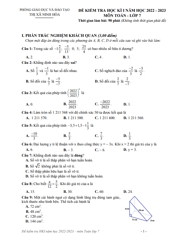 Đề học kì 1 Toán 7 năm 2022 – 2023 phòng GD&ĐT Ninh Hòa – Khánh Hòa