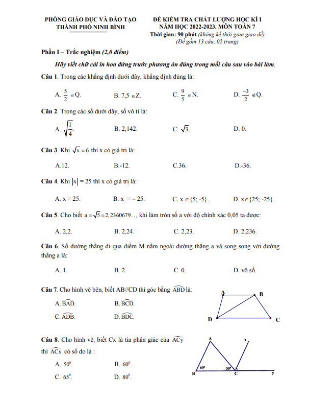 Đề học kì 1 Toán 7 năm 2022 – 2023 phòng GD&ĐT thành phố Ninh Bình