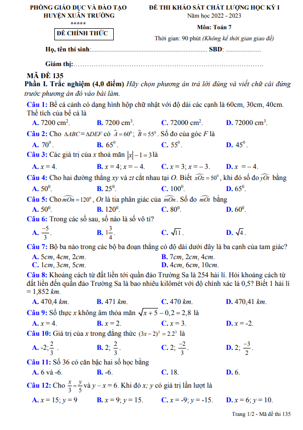 Đề học kỳ 1 Toán 7 năm 2022 – 2023 phòng GD&ĐT Xuân Trường – Nam Định