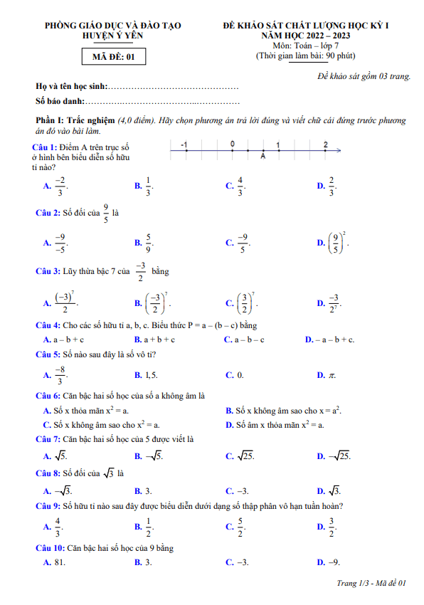 Đề học kỳ 1 Toán 7 năm 2022 – 2023 phòng GD&ĐT Ý Yên – Nam Định