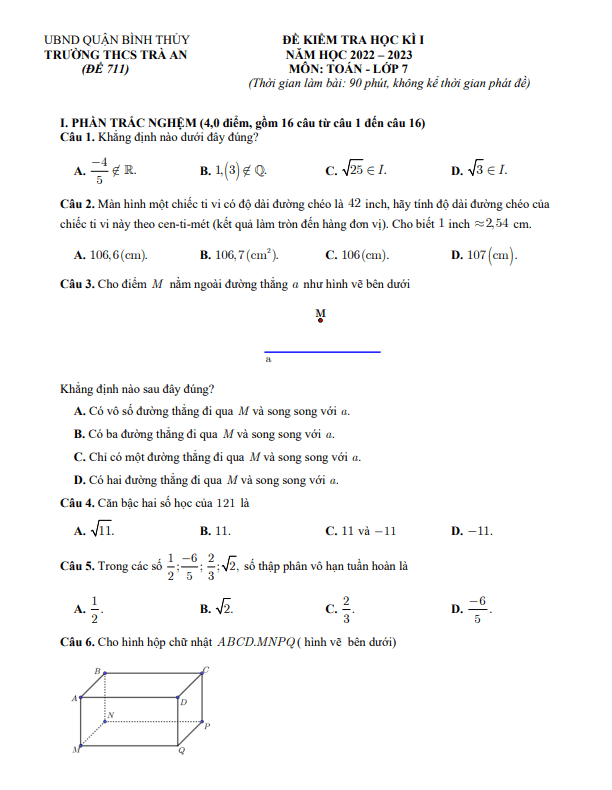 Đề học kì 1 Toán 7 năm 2022 – 2023 trường THCS Trà An – Cần Thơ