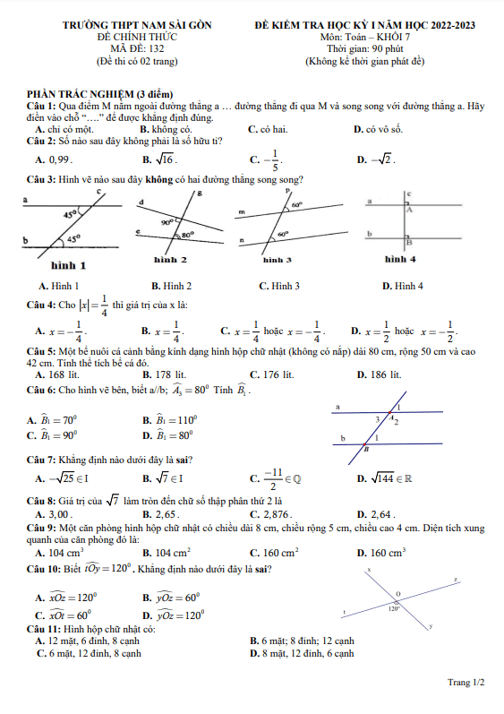 Đề học kỳ 1 Toán 7 năm 2022 – 2023 trường THPT Nam Sài Gòn – TP HCM