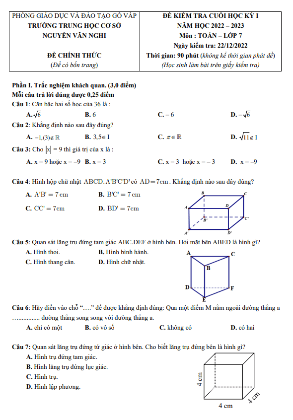 Đề cuối học kỳ 1 Toán 7 năm 2022 – 2023 trường THCS Nguyễn Văn Nghi – TP HCM