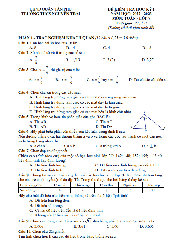 Đề học kỳ 1 Toán 7 năm 2022 – 2023 trường THCS Nguyễn Trãi – TP HCM
