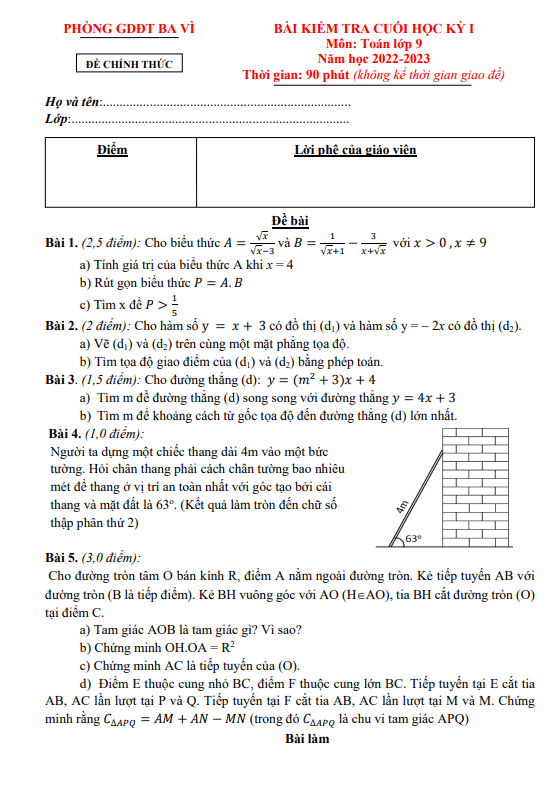 Đề cuối học kỳ 1 Toán 9 năm 2022 – 2023 phòng GD&ĐT Ba Vì – Hà Nội