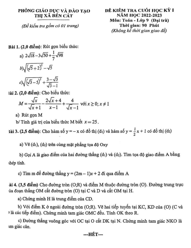 Đề cuối học kỳ 1 Toán 9 năm 2022 – 2023 phòng GD&ĐT Bến Cát – Bình Dương