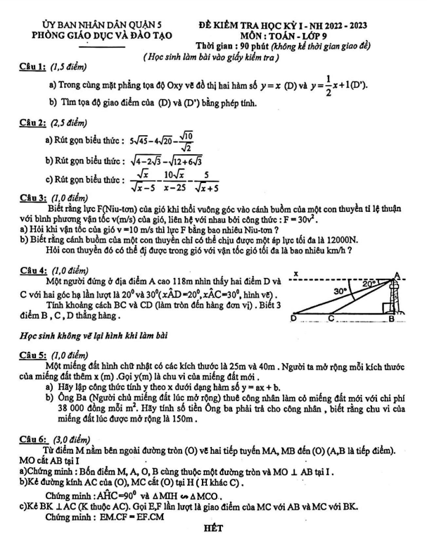 Đề cuối học kỳ 1 Toán 9 năm 2022 – 2023 phòng GD&ĐT Quận 5 – TP HCM