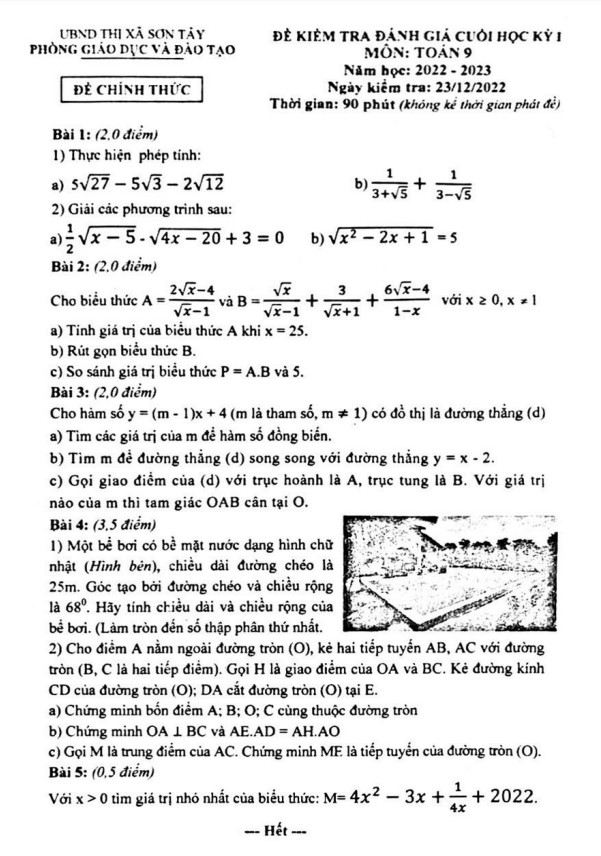 Đề cuối học kỳ 1 Toán 9 năm 2022 – 2023 phòng GD&ĐT Sơn Tây – Hà Nội