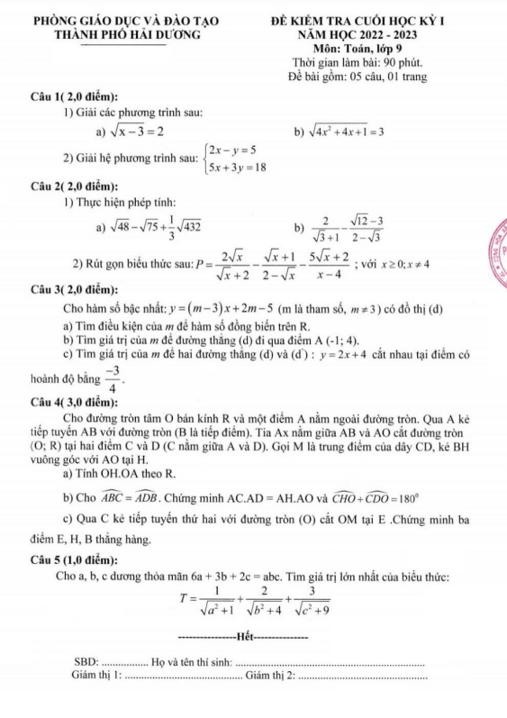 Đề cuối học kỳ 1 Toán 9 năm 2022 – 2023 phòng GD&ĐT thành phố Hải Dương