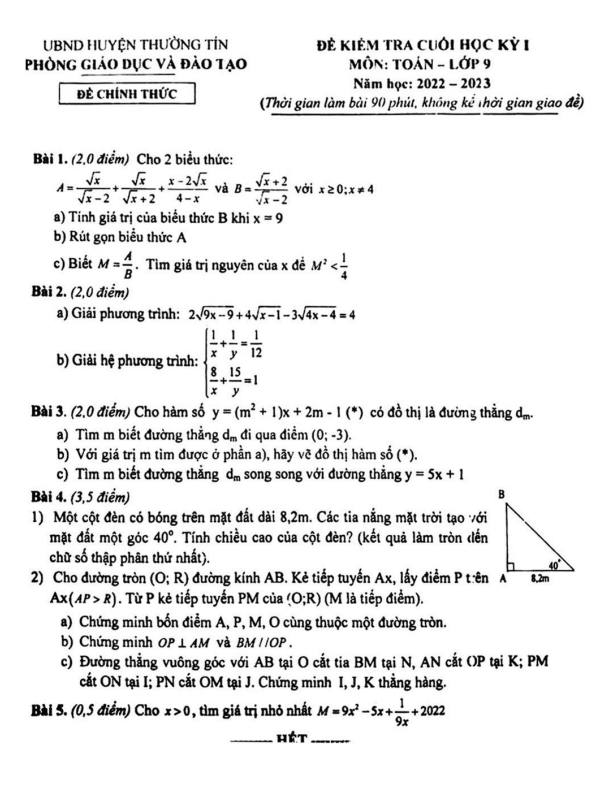 Đề cuối học kỳ 1 Toán 9 năm 2022 – 2023 phòng GD&ĐT Thường Tín – Hà Nội