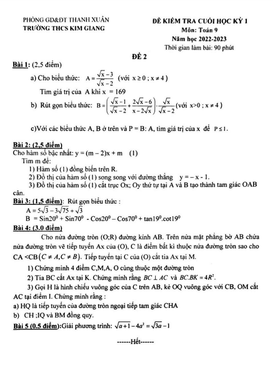 Đề cuối học kỳ 1 Toán 9 năm 2022 – 2023 trường THCS Kim Giang – Hà Nội