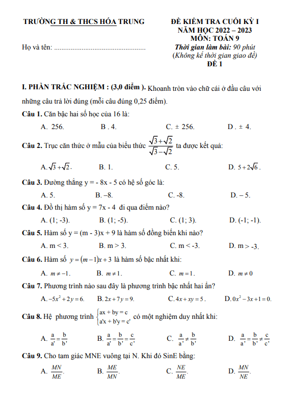 Đề cuối kỳ 1 Toán 9 năm 2022 – 2023 trường TH&THCS Hóa Trung – Thái Nguyên