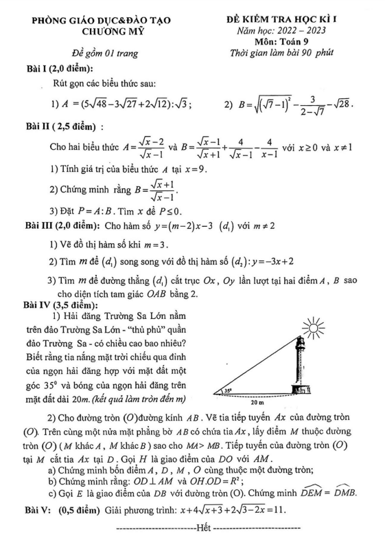 Đề học kì 1 Toán 9 năm 2022 – 2023 phòng GD&ĐT Chương Mỹ – Hà Nội