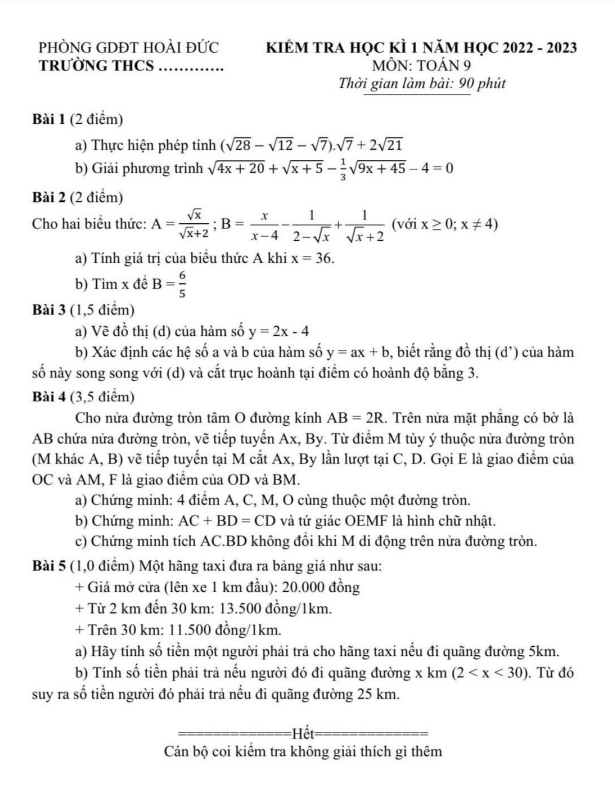 Đề học kì 1 Toán 9 năm 2022 – 2023 phòng GD&ĐT Hoài Đức – Hà Nội
