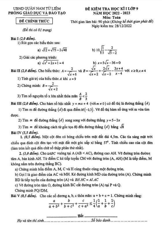 Đề học kì 1 Toán 9 năm 2022 – 2023 phòng GD&ĐT Nam Từ Liêm – Hà Nội