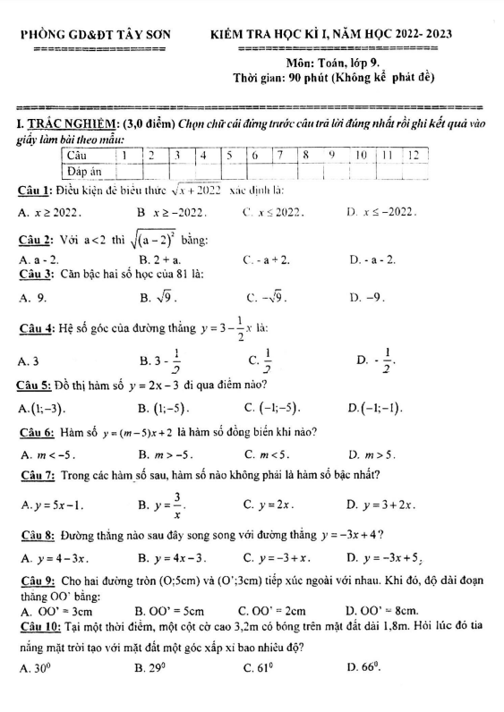 Đề học kì 1 Toán 9 năm 2022 – 2023 phòng GD&ĐT Tây Sơn – Bình Định