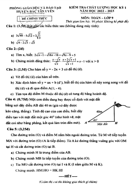 Đề học kỳ 1 Toán 9 năm 2022 – 2023 phòng GD&ĐT Bắc Tân Uyên – Bình Dương