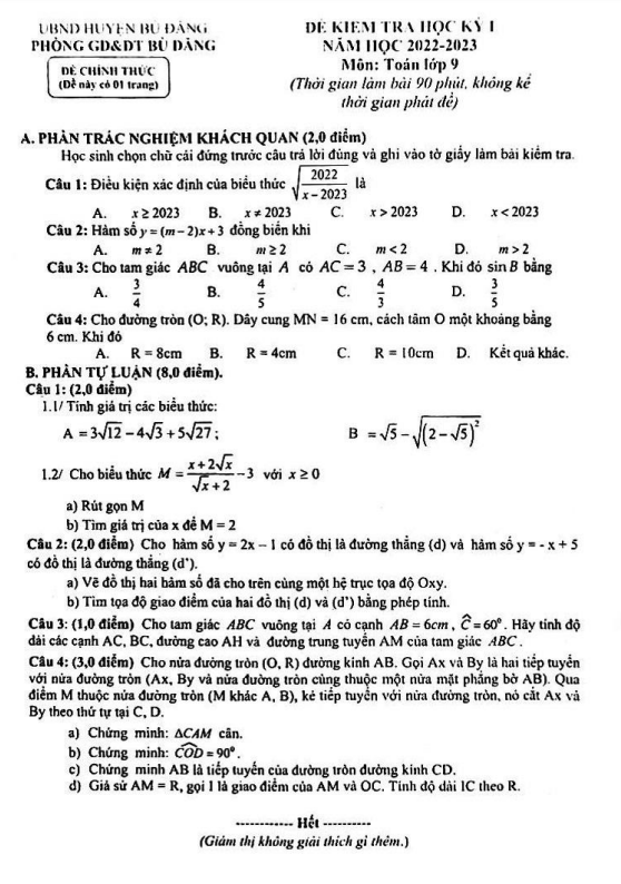 Đề học kỳ 1 Toán 9 năm 2022 – 2023 phòng GD&ĐT Bù Đăng – Bình Phước