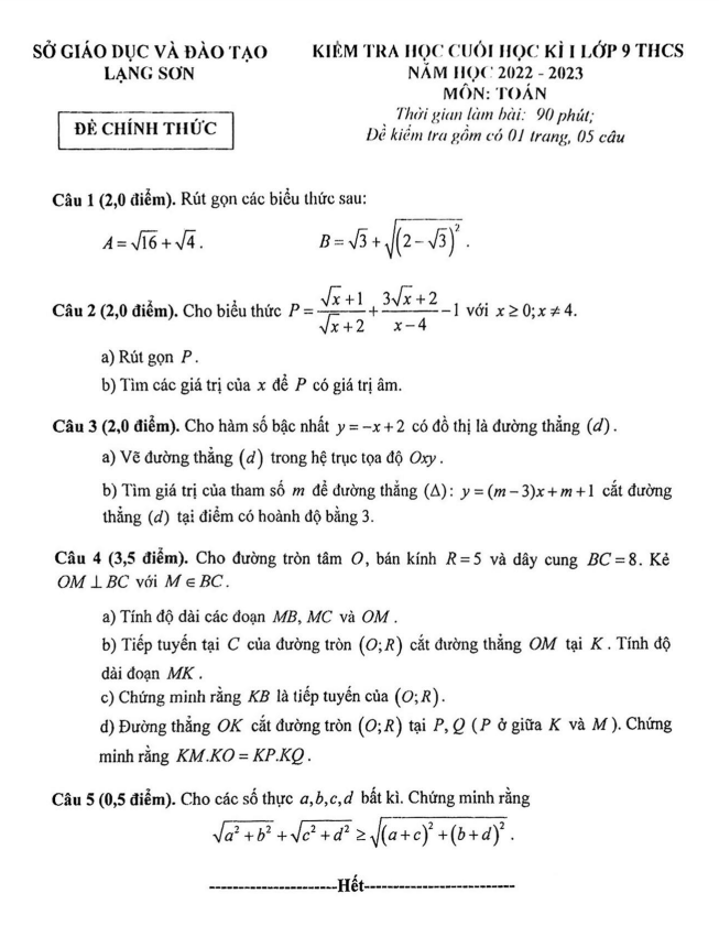 Đề kiểm tra cuối học kì 1 Toán 9 năm 2022 – 2023 sở GD&ĐT Lạng Sơn