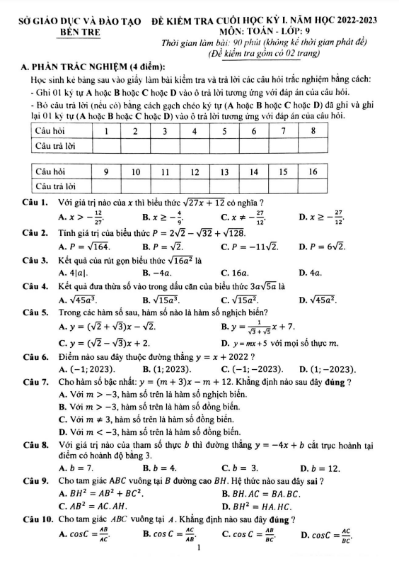 Đề kiểm tra cuối học kỳ 1 Toán 9 năm 2022 – 2023 sở GD&ĐT Bến Tre