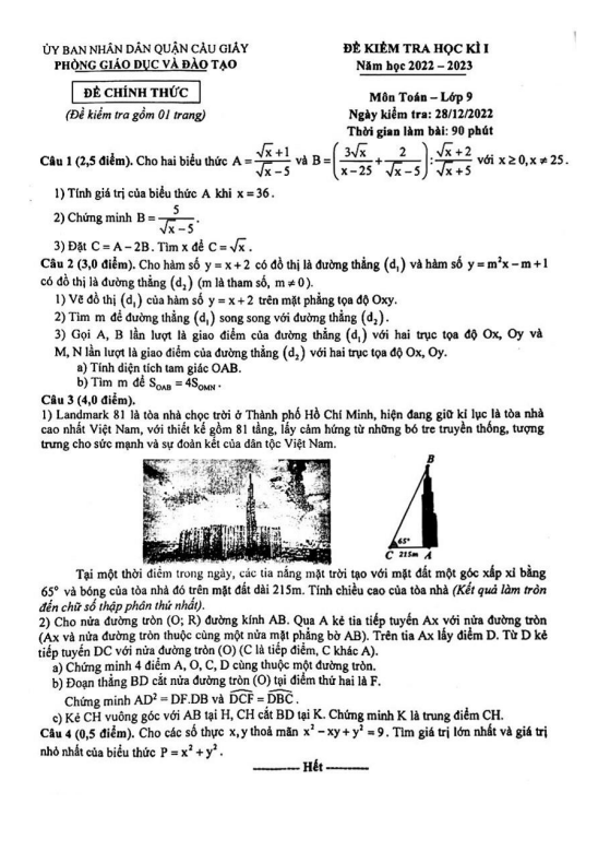 Đề kiểm tra học kì 1 Toán 9 năm 2022 – 2023 phòng GD&ĐT Cầu Giấy – Hà Nội